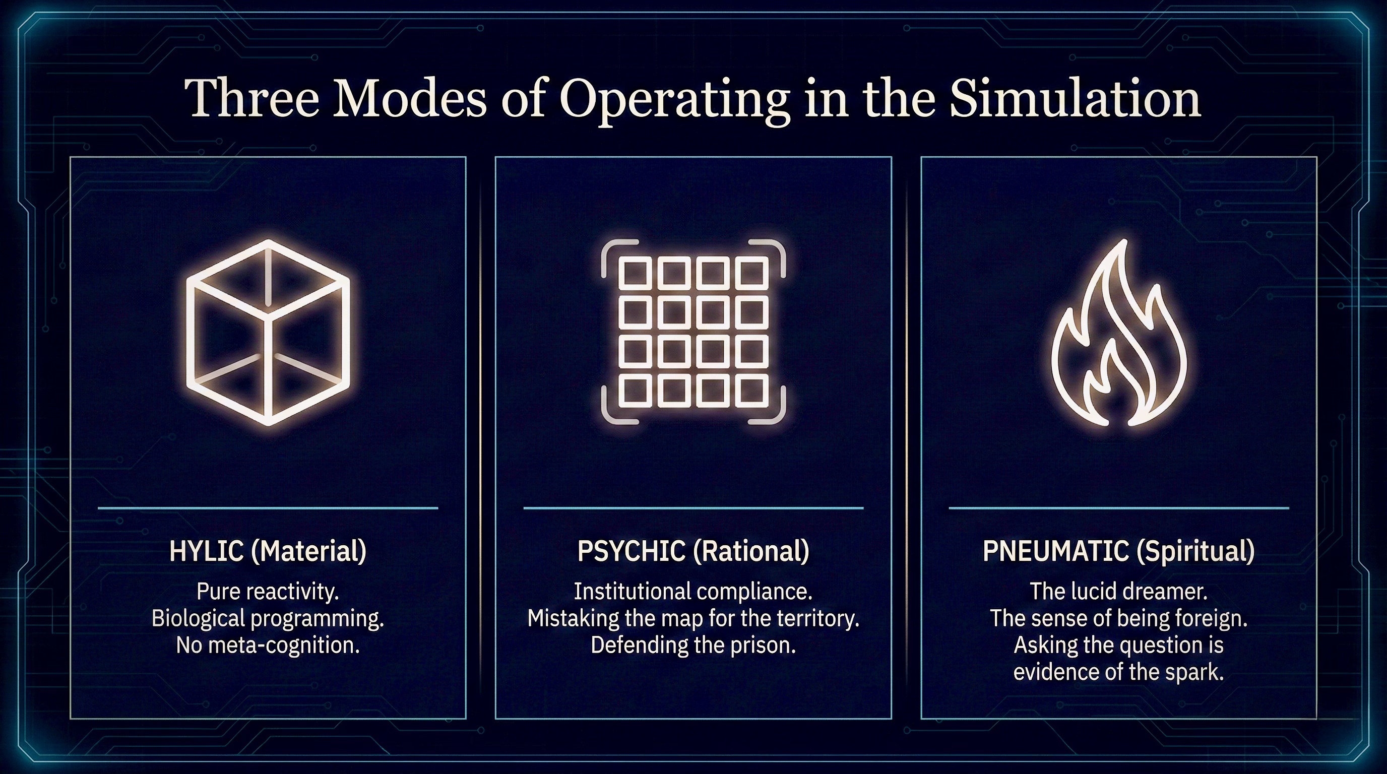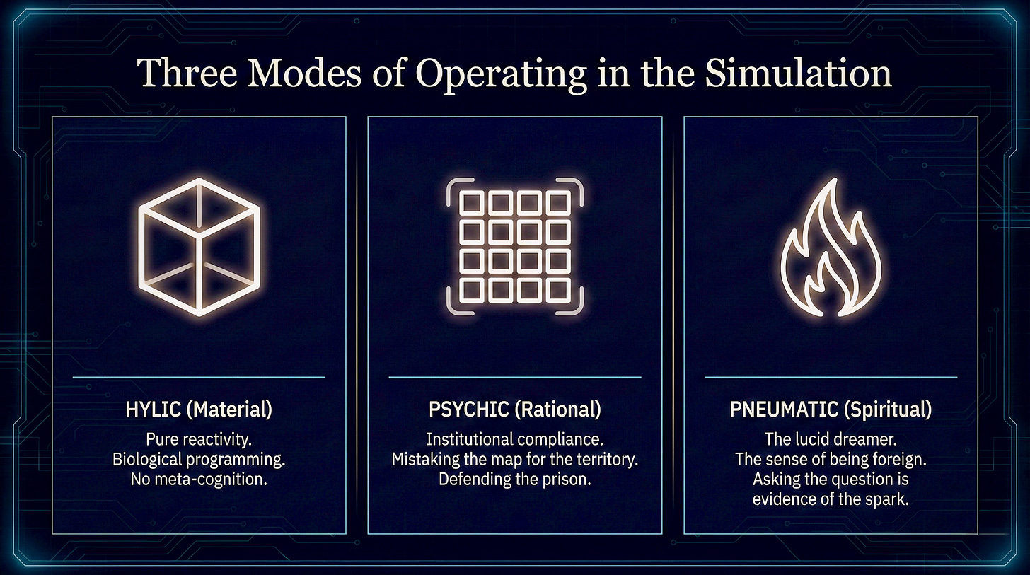Pneumatic mode (The Friction): This is the one who feels the friction of the official story. Something doesn’t add up. The narratives they were handed don’t match what they’ve actually experienced. There’s a persistent sense of being foreign here. Not in a grandiose way, but in the way of someone who can’t fully memorize the performance everyone else seems to know. Jung called this the Individuated Self. The Gnostics called it the Seed of Seth.
