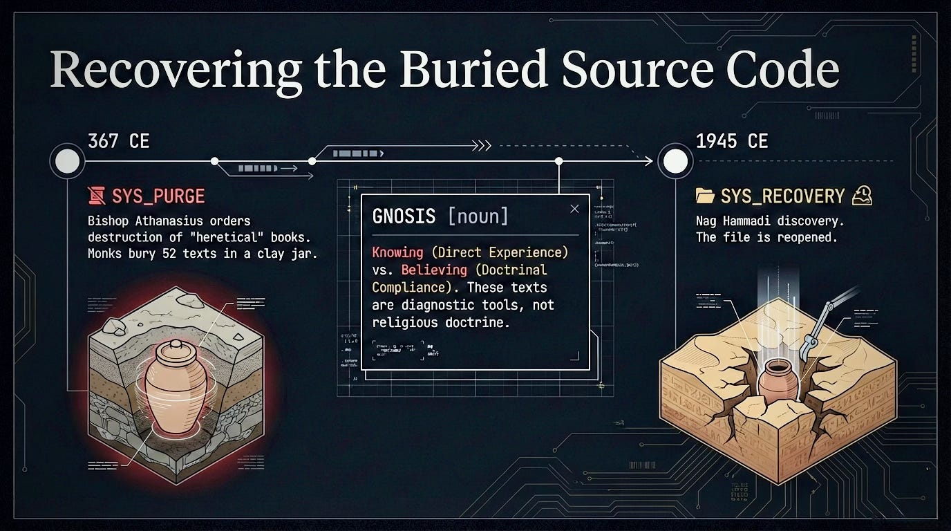 The Nag Hammadi texts are not asking you to swap one belief system for another. They are diagnostic tools. The mythology; the cosmic drama, the strange names, the inverted Genesis, is the delivery vehicle. The cargo is a set of questions about consciousness and perception: what is actually running when you think you are.